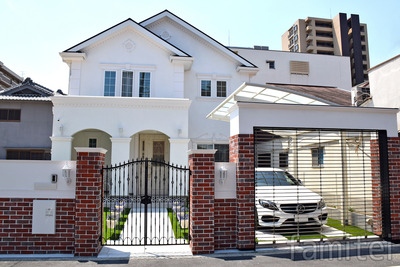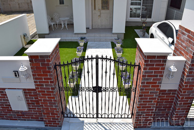 道行く人の目を惹き付ける可愛い洋風のお家に 重厚なヨーロピアンタイプの「ブルーム」門扉が 鋳物ならではの高い質感と味わいのあるディテールで フロントヤードをエレガントに演出しています。 お住まいの顔ともいえる門扉が留守中の防犯性も高め、 ご家族の帰りを優しく出向かえてくれています。