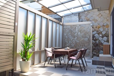 既存のウッドデッキを撤去し、新しくタイルデッキを作り 雨風対策に「Gルーフ」を施工し、側面には縦長格子タイプの 「Gスクリーン」で気になる視界も横からの雨の吹込みも防げ一石二鳥です。 プラスGの組み合せでお庭に極上のプライベート空間ができ 椅子を並べゆったりと読書したり、お子様の遊び場としてもご活用頂き ご家族様それぞれ多種多様にお使い頂いております。 施主様からは「お庭で過ごす時間が増えました。」と お喜びのお声を頂いております。