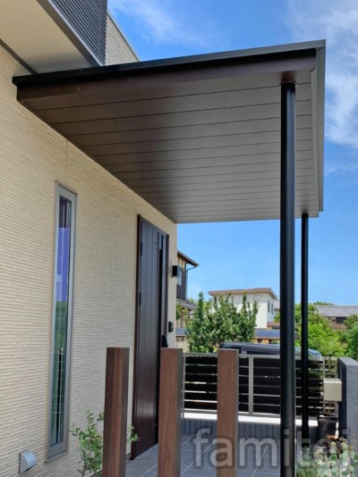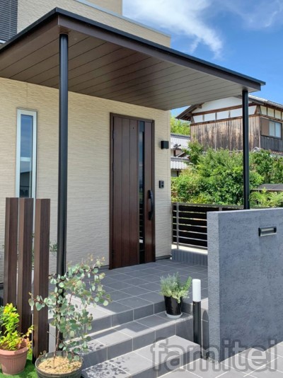 庇の無い玄関にドアと同系色の「ファンルーフ」を施工し ナチュラルで雰囲気の良いエントランスとなりました。 壁付施工のファンルーフは後付感も無く住宅との一体感があります。 玄関の屋根があることでデザイン性も高くなり、又直射日光を避けてくれる為 玄関ポーチの温度上昇も防いでくれ,雨の吹き込みにも安心です。 意匠性と利便性どちらも拘ったアプローチは ご家族様を送り出し、そして迎え入れてくれるお気に入りの住まいの顔となりました