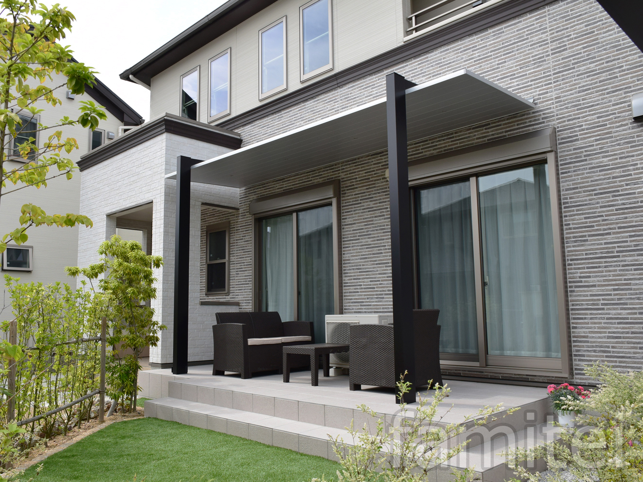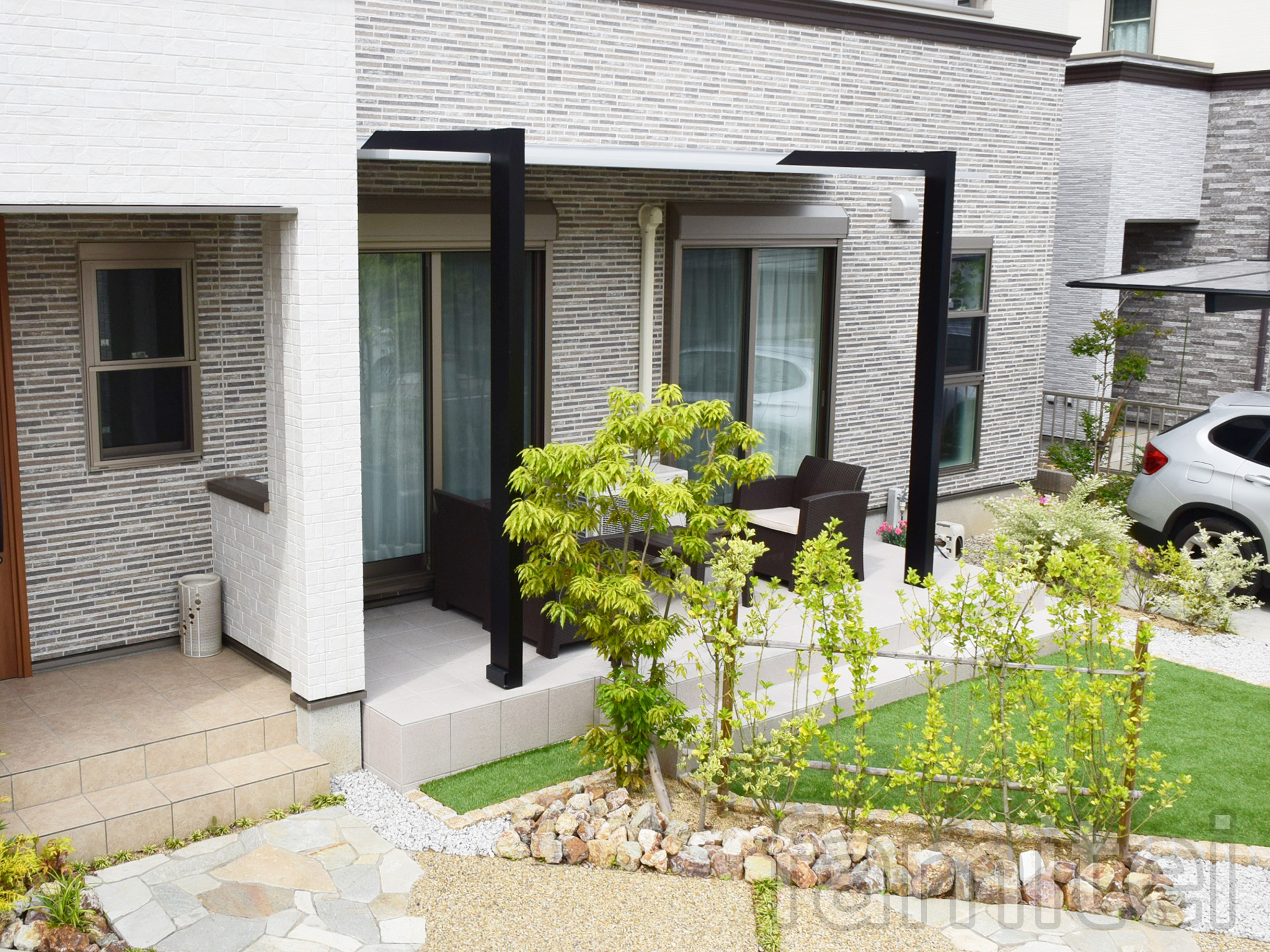 広いお庭スペースを有効活用して頂けるよう、リフォームさせて頂きました。タイルデッキスペースにはモダンなデザインが魅力的な「テラスSC」を設置させて頂き、日差しが強い日も、少々の雨が降る日も、ご家族の憩いの場としてご利用いただけるお庭になりました。また、オプションでダウンライトを設置させて頂きましたので、夜もこちらで食後のティータイムや晩酌をお楽しみ頂けます。美しい植栽に囲まれた極上のお庭が完成し、お客様にもご満足いただけた作品となりました。
