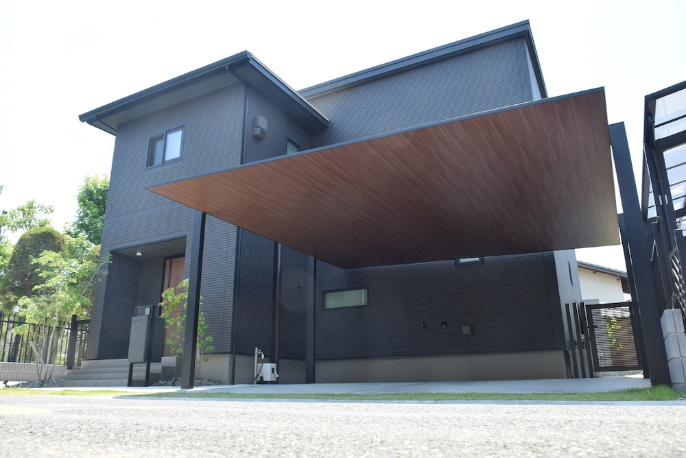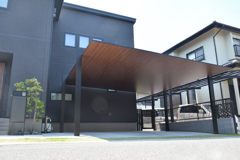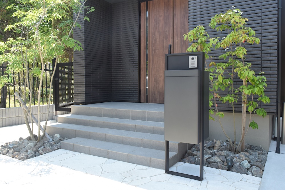 黒を基調とした重厚な邸宅を、シャープで軽やかな印象になるようデザインさせていただきました。 アルミ板屋根の「カーポートSC」は玄関扉と屋根の木目色を揃えることで一体感を出し、 機能門柱の「スマート宅配ポスト」はマットなディープグレー色を採用することで、軽やかさを演出。 エクステリア商品の色数を抑えることにより植栽のグリーンがより一層映える、魅力的なファサード空間が完成いたしました。