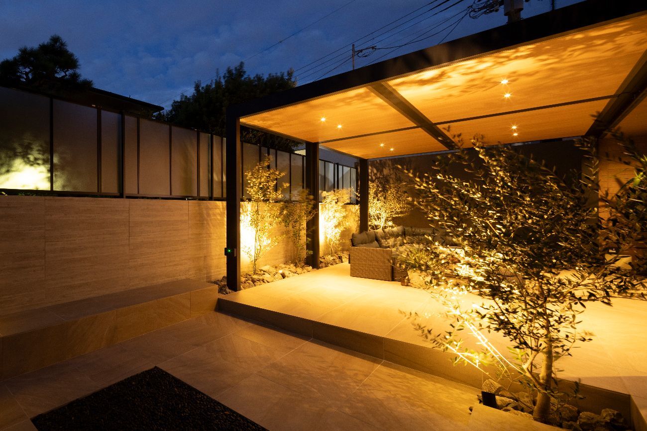 ご家族で夜間も楽しめる憩いの場をつくりたいというご希望を受け、 ホームヤードルーフを採用した極上のアウトドアリビングをご提案いたしました。 ハニーオーク色の内天井は照明との相性が抜群で、夜間でも温もりのある印象に。タイルデッキには600角タイル「アヴェルサ」を採用し、重厚感のある大人の雰囲気を演出しています。 温かい光が庭全体に広がる、心安らぐアウトドア空間が完成し、 お施主様にも大変ご満足いただける仕上がりとなりました。