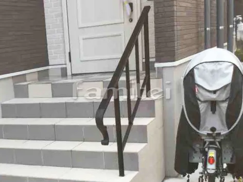 玄関アプローチ階段 床タイル貼り アドヴァン コルト 300角 ダークグレー アイボリー