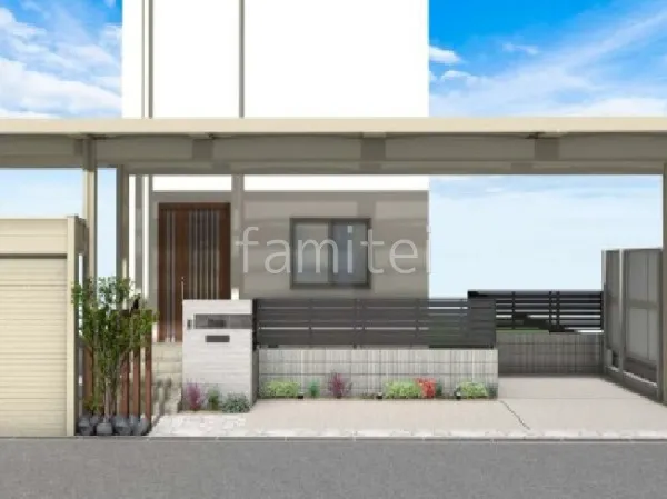 家正面に三協アルミ Uスタイルアゼストを設置。柱位置に融通を利かせることでスペースを有効的に利用できます。また採光タイプの目隠しフェンス、YKKAP シンプレオP1F型を採用することで、プライバシーを確保しつつ明るさも取り入れられます。