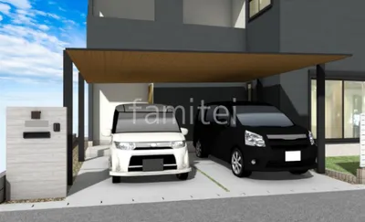 タイル門柱にはタカショー セラウォールを採用。RC杉板調でモダンなデザインです。駐車場にはLIXIL木製調カーポートSC横2台用を設置し、オプションのシームレスラインライトを追加しています。夜でも明るく使いやすいガレージとなりました。
