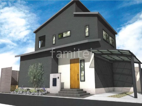 タイル門柱にはタカショー セラウォールを採用。RC杉板調で、モダンな仕上がりです。門柱のそばにはロックガーデンと、シンボルツリーとしてオリーブを植え、ナチュラルさも表現。駐車場スペースにはカーポートYKKAPアリュース1台用を設置し、雨の日でも乗り降りしやすく使いやすい車庫空間に。