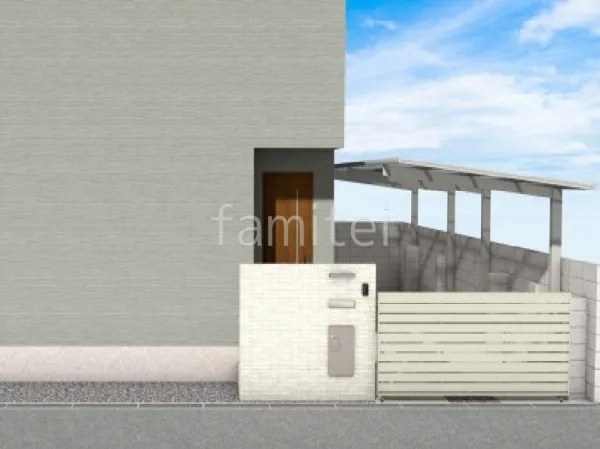 タイル門柱にはLIXILセラヴィオM(石面ボーダー)を採用。細身のタイルがスタイリッシュで現代的なデザインです。また宅配ボックスPanasonicコンボミドルで、不在時でも配達物を受け取る事が出来ます。車庫前にはLIXILオーバードアS5型を設置し、セキュリティと目隠しを両立。