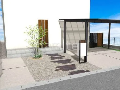機能門柱をカーポート柱横に移設し既存の枕木はそのまま砂利引きにリフォームしました。一部に緑化ブロックを設置する事で緑のラインがどこか和の雰囲気を感じさせます。また、お庭へ勝手口として木製調の片開き門扉を設置。ご自宅とのすき間には角柱によるフェンスを施工しました。