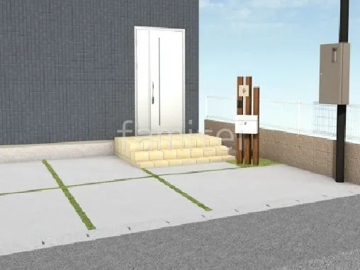 アルミ製の木製調角柱で門柱を造作し、インターホンやポストを設置しました。シンプルな門柱で使いやすくなっています。アプローチには土間コンクリートを敷設し、雨の日でも歩きやすく仕上げました。
