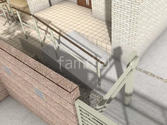 床タイル LIXIL アレスと、手すり LIXIL グリップラインで、美しく使いやすいアプローチになりました。スロープも合わせて設置することで、バリアフリーに配慮しています。