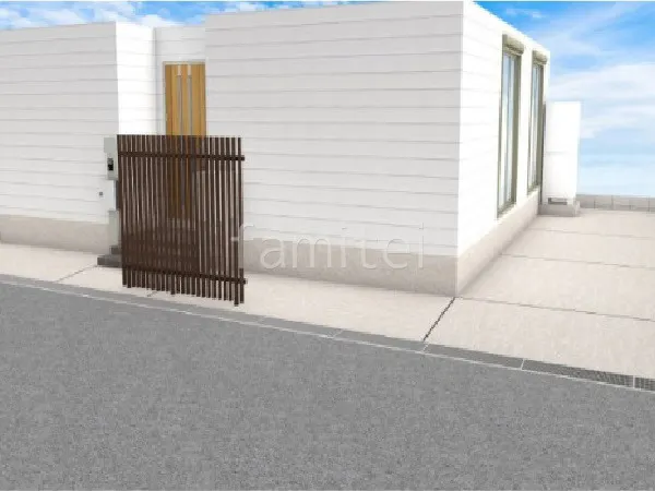 玄関前の目隠しフェンスを右にずらすことでご自宅や郵便ポストへのアクセスがしやすくなると共に、外からの視線を遮れるように。また機能門柱横に土間コンクリートを施工することで自転車なども駐輪できるなど利便性を考えつつシンプルにまとめました。