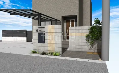 門柱は化粧ブロック ユニソン リゲルで造作。宅配ボックス付ポストで、不在時でも配達物を受け取ることが出来ます。駐車場スペースにはカーポート YKKAP エフルージュFIRSTを設置し、雨の日でも車の乗り降りが楽になりました。また土間コンクリート敷きにすることで使いやすく快適です。