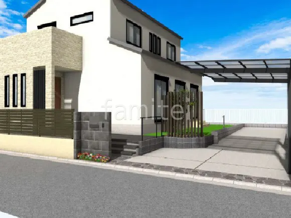 門柱のタイルにはタカショー セラレバンテを採用。石目でスタイリッシュな印象に仕上がります。アプローチ部分には黒い乱形石で和のテイストも。駐車場スペースにはカーポート LIXIL ネスカFを設置し、雨の日でも車の乗り降りがしやすくなります。