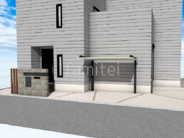 上品で重厚感を感じさせるタイル門柱に 壁タイル貼り タカショーセラレバンテ を使用しました。表札部分にアクセントとして塗り壁 エスケー化研 ベルアート塗装を施工しました。タイル門柱横に木製調デザインアルミ角柱 を設置しました。駐車場ガレージ床に土間コンクリートを施工し、目地部分にユニソン ソイルレンガを使用。サイクルポートに LIXIL カーポートSCミニを施工。シンプルでスタイリッシュなデザインのサイクルポートです。