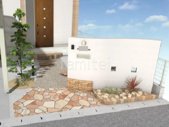 玄関アプローチ横 土間コンクリート 既存レンガ花壇 割栗石敷き