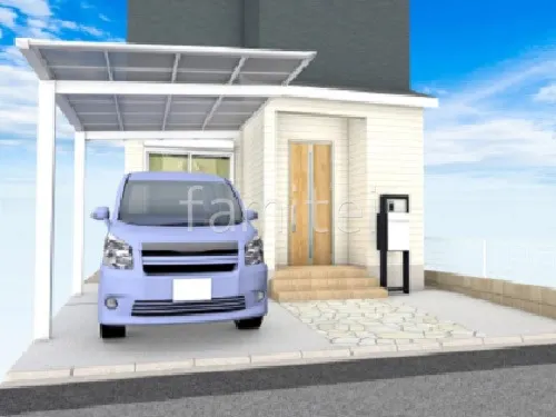 機能門柱はユニソン ヴィコDB100スタンド。宅配ボックス機能付きで、不在時でも配達物を受け取ることができます。玄関アプローチには白色の乱形石を貼り、控えめで優しい印象に。駐車場スペースにはカーポート 三協アルミ セルフィ 1台用を設置。雨の日でも車の乗り降りが楽になります。