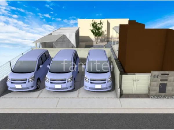 門柱には、ニッタイのロークを使用しています。ダイナミックな天然石模様を再現したタイルです。母屋までの玄関アプローチの床にグレイスランドで施工し落ち着いた雰囲気を演出しています。奥側のアプローチは、乱形石を敷き詰めて、ピンコロ石で縁取りしています。自然な風合いで個性的な印象を与えています。駐車場ガレージ床は土間コンクリート バラス目地を施工しました。目隠しフェンス塀 LIXILのAB YS3型を施工。プライバシーを守るだけでなく、防音効果もあります。既存の物置前に、サイクルポート ネスカFと立水栓 スプレスタンド60を設置しました。立水栓 スプレスタンド60は、水やりや洗車などに便利です。