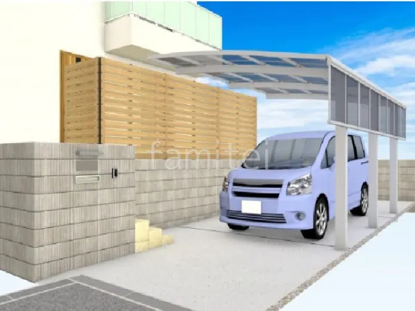 駐車スペースには耐久性とデザイン性に優れたカーポート三協アルミ カムフィエース縦連棟を使用。サイドパネル1段も取付し、雨や風から車を守っています。玄関アプローチにはシンプルでスタイリッシュなユニソン リゲルを使用した化粧ブロック門柱を施工。また、高級感と滑りにくさを兼ね備えたタイルの玄関アプローチ階段があります。玄関ポーチ前には自然な雰囲気を感じるF&F マイティウッドデコIIの目隠しフェンスが施工されています。犬走りは防犯砂利敷きで防草シートを敷いているので雑草も生えずメンテナンスも簡単です。境界フェンスには高さや幅が自由に調整できるLIXIL ハイグリッドフェンスUF8型を使用。風通しと視界を確保しています。法面側には安定感と美しさを両立させた土留めのCBブロックがあります。