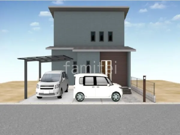 玄関アプローチの床に美しい乱形石を使用し、訪れる方を迎え入れます。機能門柱にはYKKAP ルシアスポストユニットHD03型を採用し、洗練された印象を与えます。駐車場ガレージ床は土間コンクリートで施工し、ひび割れ防止とアクセントにバラス目地を施しています。境界フェンス塀にはYKKAP イーネットフェンス3F型を使用し、開放感を演出しつつ、一定の視線遮断効果も期待できます。お庭にはLIXIL ベスパを使用したタイルデッキを設置。床タイル張りで上質な空間を作り出します。タイルデッキ隣に人工芝を敷き、四季を通じて美しい状態を保つことが出来ます。また防草シート加工を施していますので雑草の発生を抑えられます。