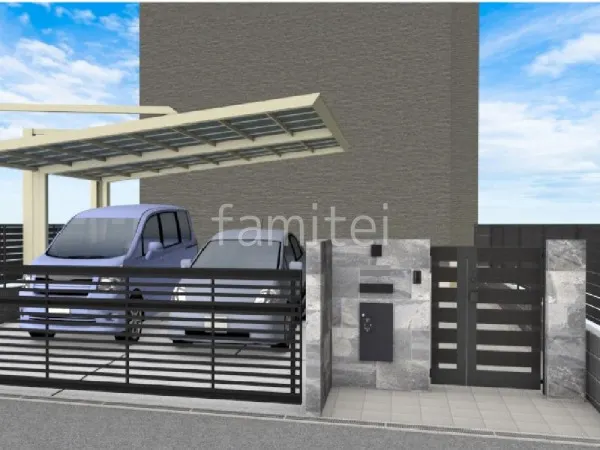 玄関アプローチ床はタイル張りで、高級感と耐久性を兼ね備えています。門柱にはニッタイ ロークを使用し、シンプルで洗練されたデザインを実現しています。門扉にはYKKAP ルシアスW02型 電気錠付きでセキュリティを強化しています。ピンコロ石花壇にはソテツを植え込み、自然と調和した雰囲気を演出しています。 跳ね上げ式ゲートはLIXIL ワイド オーバーゲートの電動タイプで、便利でスマートな出入りを実現しています。駐車場ガレージ床は土間コンクリート仕上げです。カーポートには四国化成 マイポート Nextを施工。シンプルでスタイリッシュな外観に柱が後側に有るため車の出し入れもスムーズです。