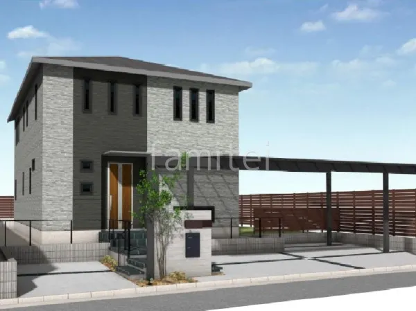 タカショー セラウォールで施工された門柱はシックで高級感を感じます。玄関アプローチ階段の床には、新井窯業のアドリアという防滑性の高い床タイルが使用されています。3台用カーポートには、YKKAP エフルージュトリプルを施工し梁延長セットを利用して1本の柱が延長されおしゃれなファサードとなりました。前駐車場ガレージは、土間コンクリートとアプローチと同じタイルで施工されたアクセントラインタイルで統一感のある車庫まわりとなりました。お庭は、人工芝敷きで手入れが簡単です。お庭に施工したウッドデッキでリラックスしたり、バーベキューを楽しんだりすることができます。お庭のプライバシ―確保のため目隠しフェンス塀 F&F マイティウッドベーシック 高尺タイプを施工しました。