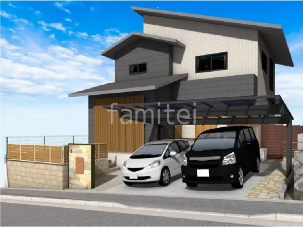 門柱はリビエラ フィオクォーツ のタイルで施工され門まわりに上品な雰囲気を与えます。玄関アプローチ床は乱形石張りで仕上げられ美しい自然な風合いを持っています。駐車場ガレージ床に土間コンクリートを使用しピンコロ石を使用した目地を配置しました。カーポートには後方柱が印象的な YKKAP エフルージュEX FIRSTを施工しています。柱が後方の2本のみなので車の出し入れも簡単です。土留めの化粧ブロックに ユニソン ステラシリーズを使用。また、土留め上部にLIXILのフェンスAB YS3型を施工してます。お庭に東洋石創 ヴィジュアルを使用したタイルデッキを施工し独立式のテラス屋根 LIXIL フーゴFテラス を設置。機能性とオシャレな外観を両立してます。