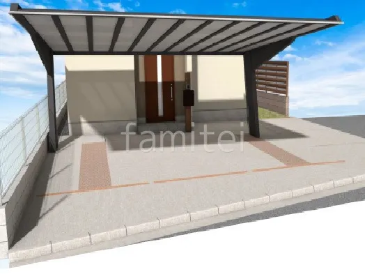 駐車場スペースにカーポート 四国化成 マイポート7を設置。後方支持タイプのカーポートで、車の出し入れの際に柱が邪魔になりにくい設計です。アルミ形材の屋根で日光を遮り、車の塗装も守ります。道路境界には目隠しフェンス LIXIL AA YT1型を設置し、採光タイプのフェンスで目隠しと同時に適度に光を敷地に取り込みます。