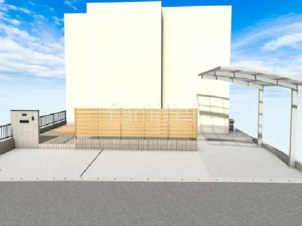 門柱のタイルはLIXIL細割ボーダー。陰影感が際立つタイルで、テーパーを取った割肌が独特のデザインを生み出します。駐車場スペースにはカーポートYKKAPアリュース1台用を設置。高品質で耐久性のある屋根で、車を雨風から保護します。目隠しフェンスF&FマイティウッドデコIIはリアルな木目調がナチュラルで、優しい空間を作り出します。