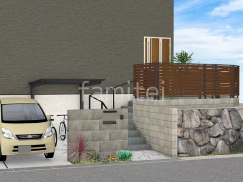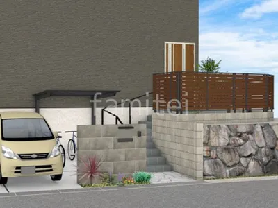 タイル門柱はタカショー セラレバンテを使用。石目調の大判タイルがモダンかつ自然に調和します。玄関アプローチ階段はL字にすることで外観が華やいだ雰囲気になり、手すりを設置することで安全性にも配慮しています。お庭のタイルデッキにはタカショー セラウッディーを使用し、木目の美しさとタイルデッキの機能性の高さを両立しています。