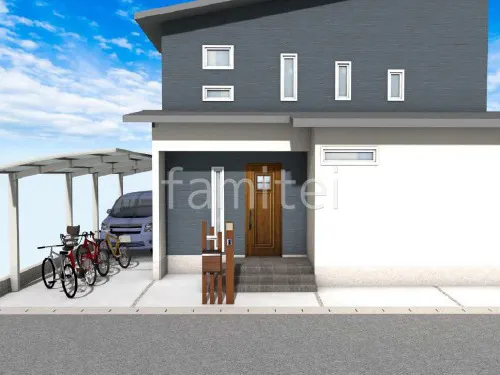 木製調デザインアルミ角柱 プランパーツで門柱を造作しました。シンプルで機能的にまとまっています。駐車場スペースにはカーポート YKKAP アリュース 縦2台用を設置。車や自転車を雨風から守る事が出来ます。お庭にはタイルデッキと独立式テラス屋根 YKKAP レセパLタイプを取り付け、お庭を更に憩いの場としてご活用いただけます。