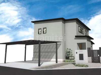 タイル門柱にはタカショー セラウォールを採用。RC杉板調の大判タイルが、都会的ながら自然と調和します。玄関アプローチにはタカショー セラレバンテを貼り、人気の石目調タイルでクールな印象を与えます。駐車場スペースにはカーポート YKKAP エフルージュFIRST 横2台用を設置し、大切な車を雨風や紫外線から守ります。
