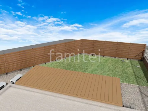 お庭に人工芝を敷き、道路境界に目隠しフェンス F&F マイティウッドデコIIを設置しました。お庭のプライバシーが保たれます。