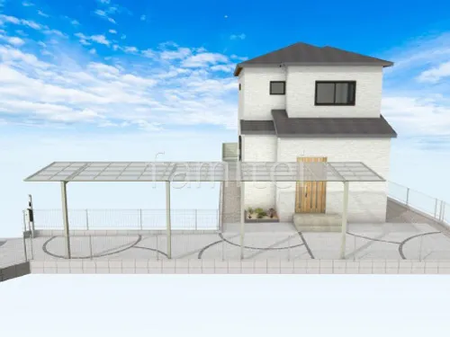 旗竿の立地を生かして、駐車場スペースにはカーポート LIXIL フーゴF 縦2台用を設置。地面は土間コンクリート打ちにすることで、歩きやすく、雑草の心配もありません。レンガ目地を曲線にすることで柔らかな印象となり、かわいい仕上がりです。