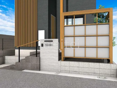 門柱に使用したタイルはタカショー セラウォール。RC杉板調の大判タイルが、都会的でモダンな雰囲気です。玄関アプローチ前には目隠しフェンス Gスクリーン 角格子 パネル3段タイプを設置。木目調が美しく、また個性的な形状で印象付けます。