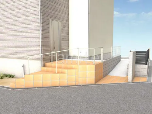 玄関アプローチにスロープを併設し、車いすやベビーカーでも玄関へ上がりやすいアプローチになりました。階段もリフォームし、手すり LIXIL アーキレールがついた、使いやすい階段になっています。
