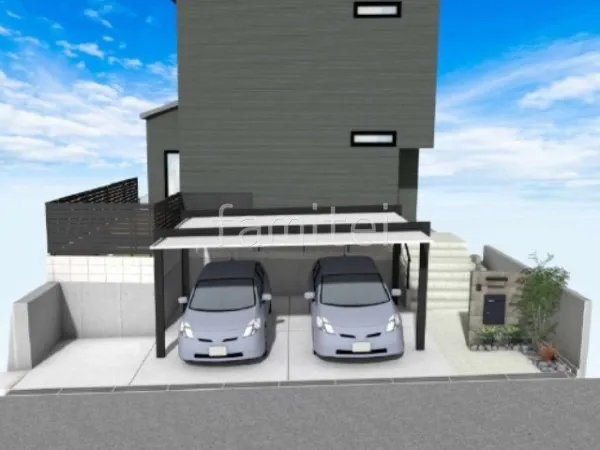 駐車場に2台用カーポート LIXIL カーポートSCを設置し、スタイリッシュで高級感のあるデザインが特徴で、駐車スペースをモダンな印象に仕上げます。 お庭にはメンテナンスフリーな人工芝を敷き、ウッドデッキ LIXIL 樹ら楽ステージを設置して緑と木目の温もりが調和した快適なお庭空間を作りました。 更に、お庭周りには目隠しフェンス LIXIL AB YS3型を設置してプライバシー保護もばっちりです。 門柱には大判タイル タカショー セラレバンテを使用して重厚感のあるデザインに仕上げました。