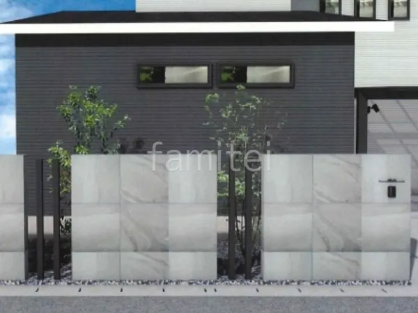 タイル門塀と角柱がモダンな新築シンプル オープン外構