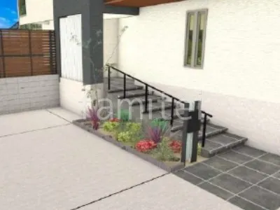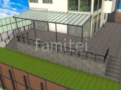 駐車スペースに4台用カーポート 四国化成 マイポートnextを設置し、スタイリッシュな外観で車を雨風や日差しからしっかり守ります。 お庭には300角タイル LIXIL グレイスランドを使用した広いタイルデッキを新設し、デッキ上にテラス屋根 YKKAP ソラリアFを設置することでリラックスできる空間を作りました。 また、人工芝でお庭を彩り、お手入れが簡単で1年中美しい緑を楽しむことができます。 敷地境界には目隠しフェンス LIXIL 木製調AB YS3-K型やYKKAP シンプレオFP1型の多段タイプを設置して周囲からの視線を遮ります。