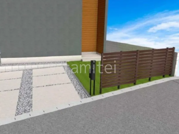 玄関前の駐車スペースにあった土間コンクリートと砂利を撤去して整地し、人工芝を敷くことで、メンテナンスフリーで柔らかな雰囲気の緑豊かなお庭空間を作りました。 道路側には目隠しフェンス F&F マイティウッドデコllを設置し、プライバシーを守りつつ、木調で柔らかな雰囲気をプラスしました。
