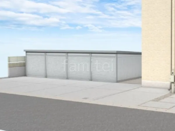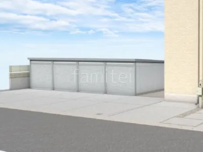 駐車スペースにシャッターガレージ イナバ物置 ガレーディア 4連棟を設置し、複数台の車を風雨や盗難から守る安心感をプラスしました。 境界周りには目隠しフェンス LIXIL AB YS3型を配置し、プライバシーをしっかりと確保しました。 さらに、建物横には2台用カーポート YKKAP アリュースを設置し、実用性を向上しました。 また、門柱は利便性の高い機能門柱 LIXIL アクシィ1型を採用しました。