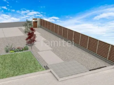 エントランスに機能門柱 YKKAP 木製調ルシアスポストユニットHF01型を設置し、木目デザインの暖かみのある雰囲気をプラスしました。 境界には目隠しフェンス LIXIL 木製調AB YS3-K型を採用し、プライバシーをしっかりと守ります。 お庭スペースには人工芝を敷き、メンテナンスフリーで緑豊かな景観を演出します。 さらに、アプローチには飛び石風デザインの土間コンクリートを用いて、個性のあるアプローチに仕上げました。