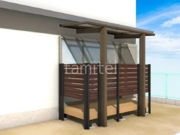 掃き出し窓の外にウッドデッキ LIXIL 樹ら楽ステージを設置し、その周囲を目隠しフェンス F&F マイティウッドデコllで囲むことで、プライバシーを守りつつ、家族や友人との憩いの場を作りました。 さらに、テラス屋根 YKKAP 独立式レセパ Lタイプを採用することで、雨や日差しを遮り、季節を問わず快適に過ごせる空間に仕上げました。