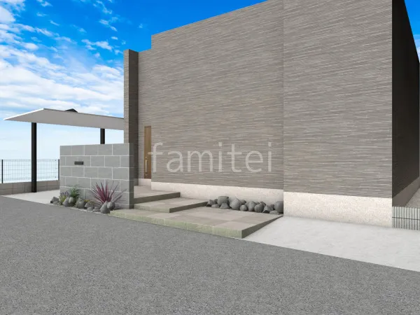 門柱にはタカショー セラマイカを張り付け、優しいグレーがお客様をお出迎えします。ロックガーデンを造作することで、モダンかつ自然な風合いを楽しむことができます。駐車場スペースにはLIXIL カーポートSC 縦2台用を設置。アルミ型材屋根ですので、日光を屋根下に通さず、紫外線や雨から大切なお車を守ります。