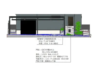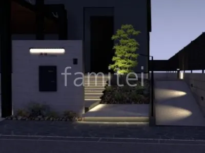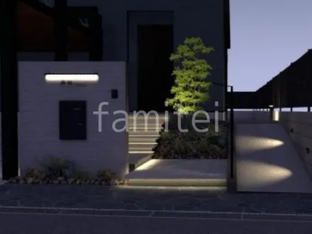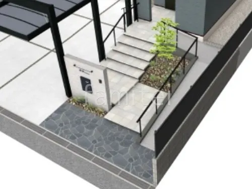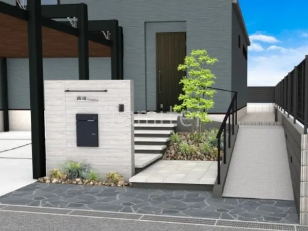 広々とした駐車スペースに4台用カーポート 三協アルミ Uスタイルアゼストプレミアムを設置し、重厚感と高級感を兼ね備えた大空間を確保しました。 また、目隠しフェンスに三協アルミ エルファード片面M4型とYKKAP シンプレオYL1型を採用し、プライバシーを守りながらスタイリッシュな印象をプラスします。 アプローチには黒の乱形石を敷き、自然な風合いを演出。 玄関階段は蹴込階段で立体感を持たせました。 門柱には大判タイル タカショー セラウォールを使用し、エントランスに上品な雰囲気を与えます。