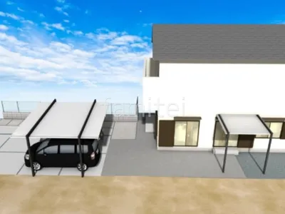 道路から玄関へと続くアプローチには洗出し仕上げを採用し、上品で温かみのある印象に。 駐車スペースに2台用カーポート LIXIL カーポートSCを設置し、スタイリッシュなデザインで車を雨や日差しからしっかり守ります。 さらに、1階用テラス屋根 LIXIL テラスSC 壁付けタイプを取り付け、屋外でも快適に過ごせる空間を確保しました。