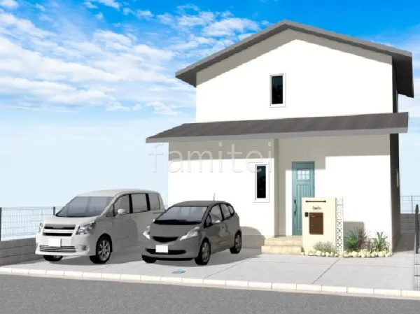 白い塗り壁門柱とロックガーデンでナチュラルさを演出したオープン外構です。足元の植栽がさらに自然の温かみをプラスしてくれています。2台の駐車スペースは広々としており、車の出入りもしやすく配慮されています。朝日スチールのPCフェンスはアメリカンなデザインで、シンプルながらも映えるお庭まわりになります。