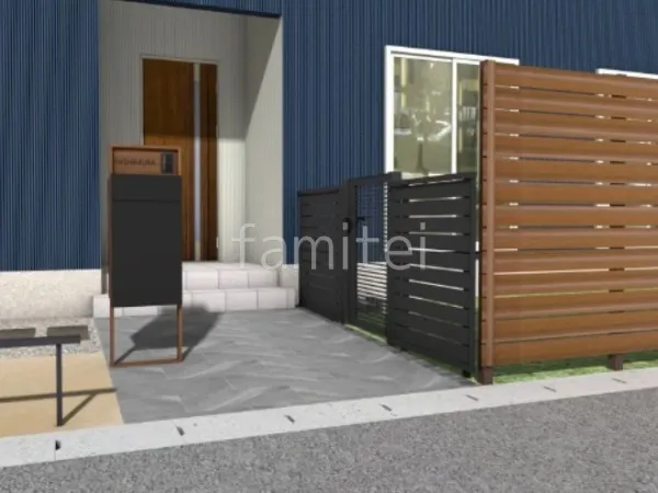 大判タイル タカショー アヴェルサと平板 ユニソン リビオプラスを使用したアプローチは、上品で歩きやすい動線を演出します。 門柱は便利な宅配ボックス付き機能門柱 LIXIL 木製調FFは、ナチュラルな印象の外観でエントランスを彩ります。 お庭にはお手入れが簡単な人工芝を敷き、目隠しフェンス F&F マイティウッドデコllとLIXIL AB YS3型でプライバシーを確保しながら温もりある空間に仕上げました。 さらに、片開き門扉 LIXIL AB YR2型を設置し、防犯性をアップしました。