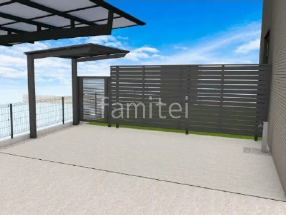 駐車場の後方にサイクルポート LIXIL ネスカFミニを設置し、自転車の保護スペースを確保しました。 お庭スペースは既存土間コンクリートの上に人工芝を敷き、緑豊かな空間に生まれ変わりました。 また、多段目隠しフェンス LIXIL AB YS3型と片開き門扉 LIXIL AB YR1型を設置することで、お庭のプライバシーをしっかりと守ります。
