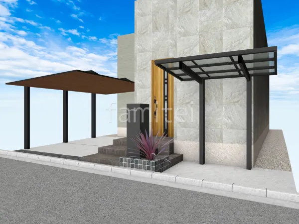 木目調屋根のカーポートがカッコいい新築ベーシック オープン外構