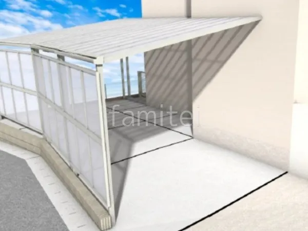 既存のカーポートを撤去し、敷地の形状に合わせてカット加工を施した1階用テラス屋根 YKKAP ソラリアFを新たに設置し、オプションで前面パネルを取り付けることで雨風の吹き込みを軽減し、快適な屋外空間を確保しました。 また、片開き門扉 LIXIL AB YR2型を設置し、防犯性を向上しました。